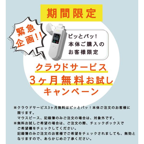 | ●感染症の予防などの観点から、複数人での使用はしないでください。 ●ご使用に際しては、必ず付属のマウスピースを使用してください。 ●十分に換気をした環境で測定を行ってください。 ●測定前に手指をアルコールで消毒した場合は、十分に乾燥させてから測定を行ってください。 ●飲食後は20分以上経過してから、もしくはしっかりうがいをしてから測定してください。 ●不良があった場合、まずは、メールか電話にてお問い合わせください。 | |