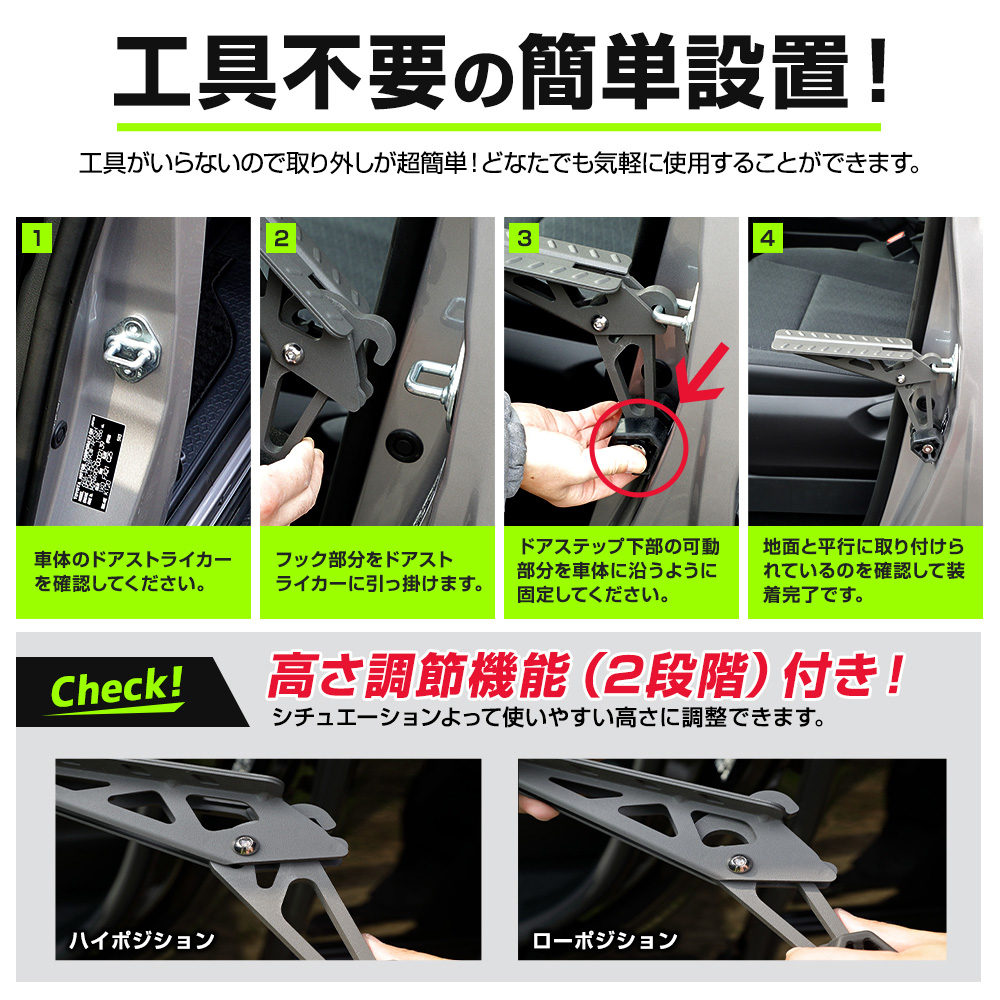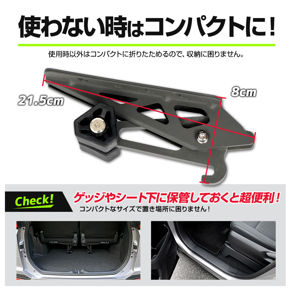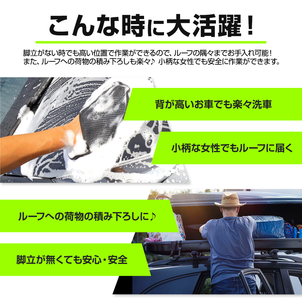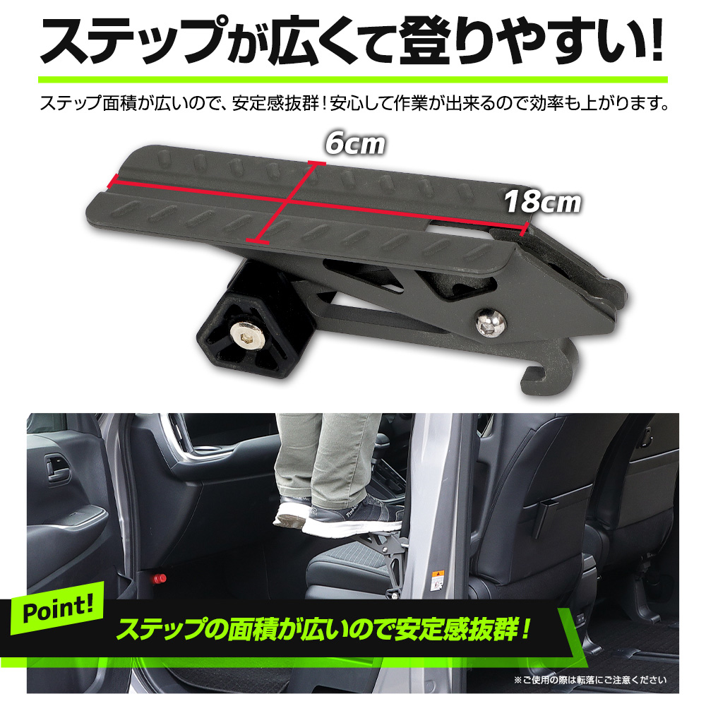 | 簡単取り付けで、ルーフへの荷物の積みおろしや洗車に便利なドアステップ。 他社商品に比べて高い位置に設置可能。さらに便利に大活躍! これさえあれば脚立はもう必要ありません。 工具不要の簡単設置!ドアストライカーにひっかけるだけ! どなたでも簡単にお気軽に使用可能です。 ステップ面積が広く、安定感抜群!より快適にルーフ周りの作業を行うことができます。 また、ステップの表面には滑り止め加工が施し安全性を高めています。 素材には高強度鋼(AHSS)を採用しており、強度・剛性もバッチリ! 耐荷重量は180kgで、使用される方の身体をしっかりと支えます。 さらに、車体に接触する箇所には軟質素材を採用しているので、大切なお車を傷付けることはありません。 使用時以外はコンパクトに折りたためるので、邪魔にならず車内に保管可能です。 ラゲッジスペースやシート下に常備しておくとルーフ周りの作業に大変便利です。 |