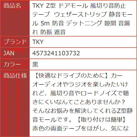 | 商品名 | Z型 ドアモール 風切り音防止テープ ウェザーストリップ 静音モール 5m 防音 デットニング 隙間 音漏れ 防振 遮音 |