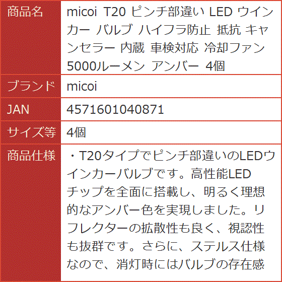 | 商品名 | T20 ピンチ部違い LED ウインカー バルブ ハイフラ防止 抵抗 キャンセラー 内蔵 車検対応 冷却ファン 5000ルーメン アンバー 4個 |