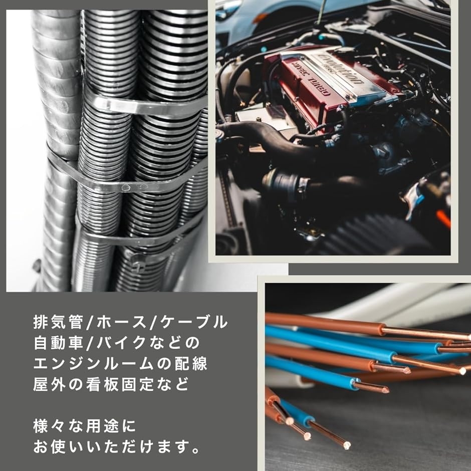 高温排気管やマフラーカバーの固定、ホースや電線管の結束、さらには標識板やポールの設置など、幅広い用途に対応可能。
