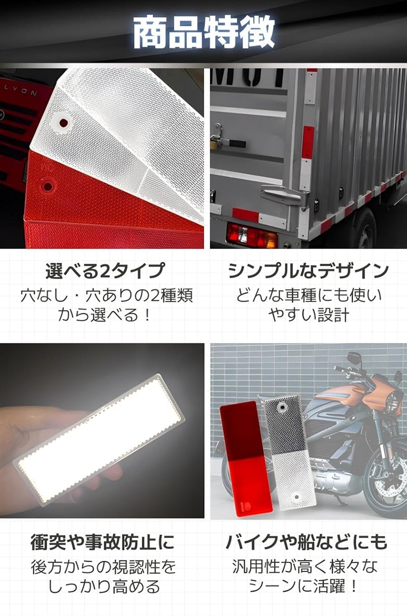 「商品特徴」(1)選べる2タイプ:穴なし・穴ありの2種類から選べる。/(2)シンプルなデザイン:どんな車種にも使いやすい設計/(3)衝突や事故防止に:後方からの視認性をしっかり高める/(4)バイクや船などにも:汎用性が高く様々なシーンに活躍。
