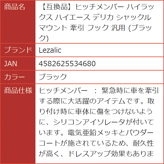 | 商品名 | 互換品ヒッチメンバー ハイラックス ハイエース デリカ シャックル マウント 牽引 フック 汎用 ブラック |