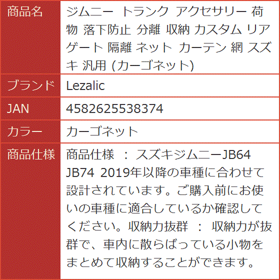 | 商品名 | ジムニー トランク アクセサリー 荷物 落下防止 分離 収納 カスタム リアゲート 隔離 ネット カーテン 網 スズキ 汎用 カーゴネット |