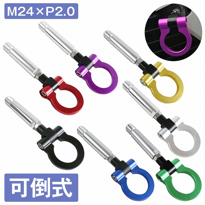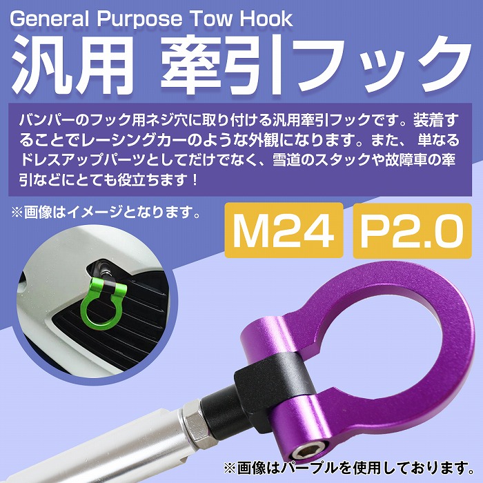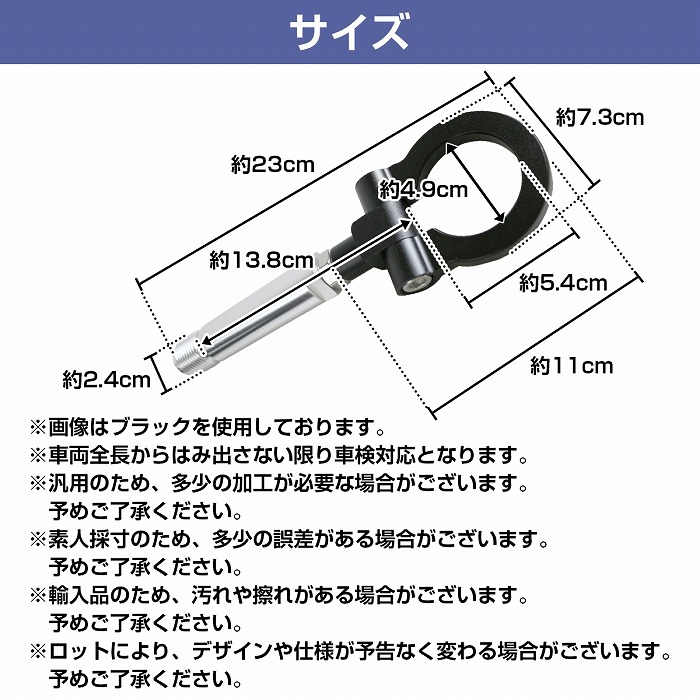 | ◆サイズ:商品画像5枚目を確認ください。 ◆ネジサイズ:M24×P2.0 ◆カラー(全7色):ブラック/ブルー/ゴールド/グリーン/パープル/レッド/シルバー ※本商品は安全耐荷重検査確認等は行っておりません。 ※あくまでもドレスアップパーツとしてご使用ください。 ※本格的な牽引使用の場合は自己責任にてお願いします。 ※牽引時に起きた問題は如何なる場合も当店では一切の責任を負いません。 ※汎用タイプのため、多少の加工が必要な場合がございます。 |