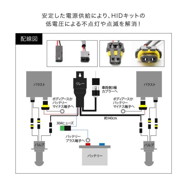 | 安定した電源供給により、HIDキットの低電圧による不点灯や点滅を解消! ※ご購入前に必ずリレーのソケット形状をご確認ください※当社、HID商品の互換品です。他社商品との適合は保証しておりません |