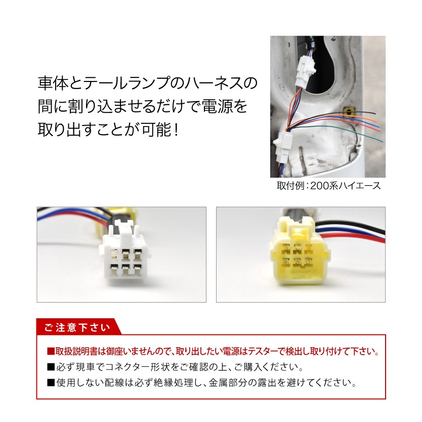 | 車両側コネクタとテールカプラの間に差し込むだけで簡単電源取り出し! LEDリフレクター等の配線に便利! ■ブレーキ(+)、■ポジション(+)、■アース(-)を検出可能です。 ※取扱説明書は御座いませんので、取り出したい電源はテスターで検出し取り付けて下さい 【確認事項】 取扱説明書はございません。取り出したい電源はテスターで検出し取り付けて下さい 必ず現車でコネクター形状をご確認の上、ご購入下さい 使用しない配線は必ず絶縁処理し、金属部分の露出を避けて下さい |