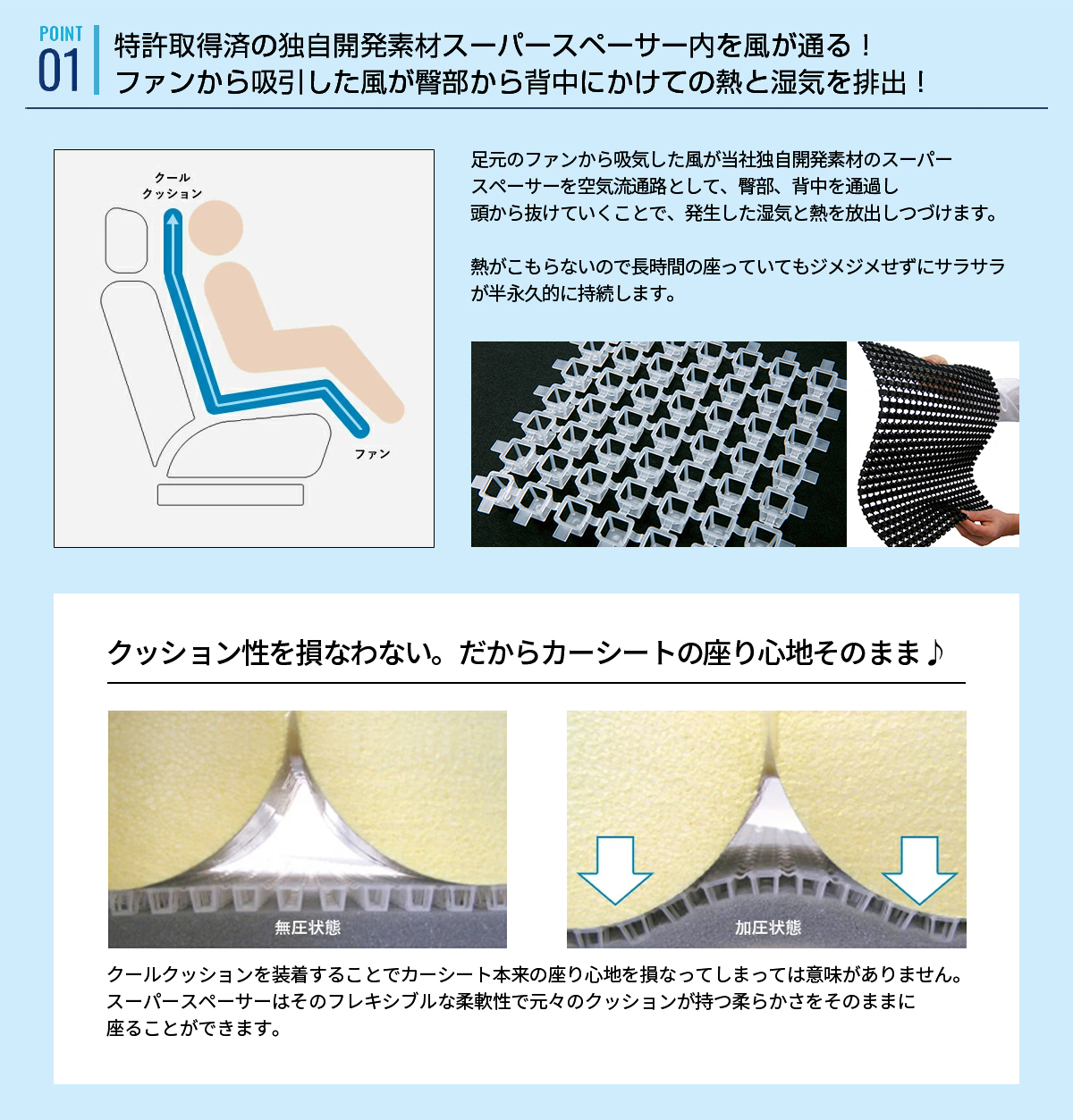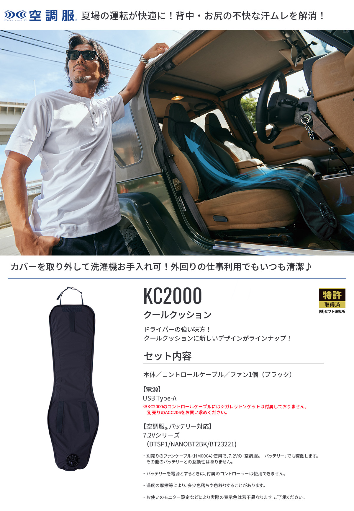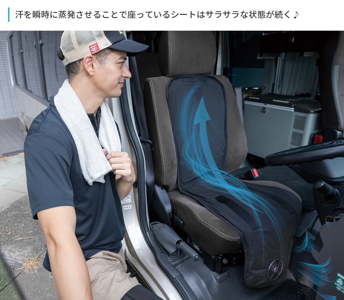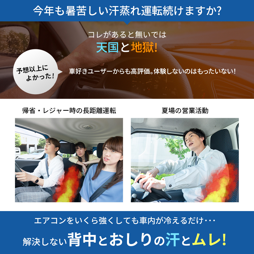 | 製品説明 | 真夏のドライブの頼もしい味方。 体に対して平行に大量の空気を流し、かいた汗を瞬時に蒸発させることによって最適の冷却効果をもたらします。 エアコンを弱めにしても効果があり、省エネドライブも期待できます。 カバーを取り外して、洗濯機でのお手入れも可能です。 ※スーパースペーサー、ファン、コントロールケーブルは外してください。 |