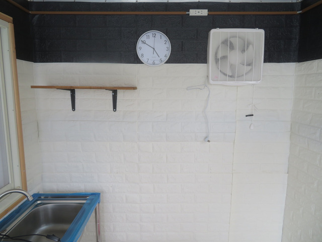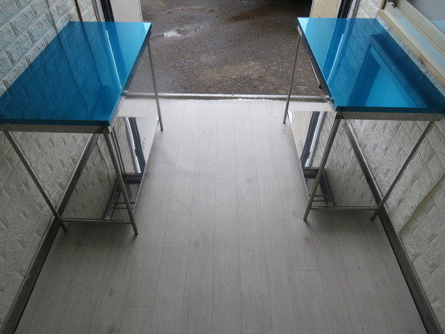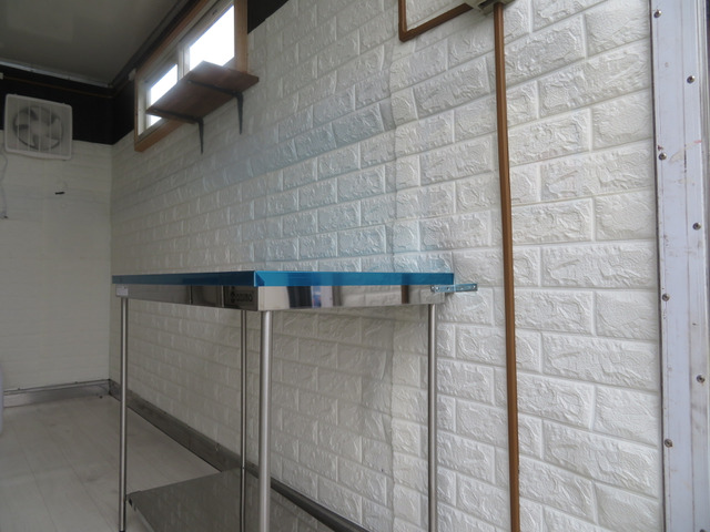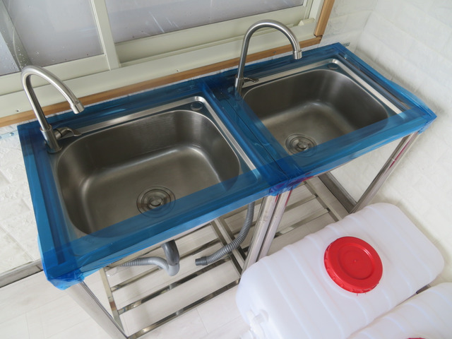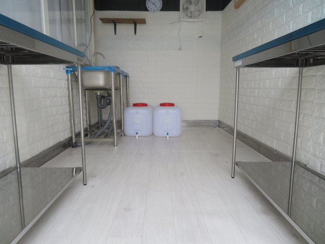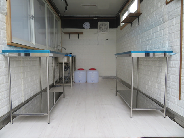 ☆ステンレス作業台2台、ステンレス製ダブルシンク・給排水タンク付き、換気扇、照明器具等、サッシを含め装備品はいずれも新品未使用です。