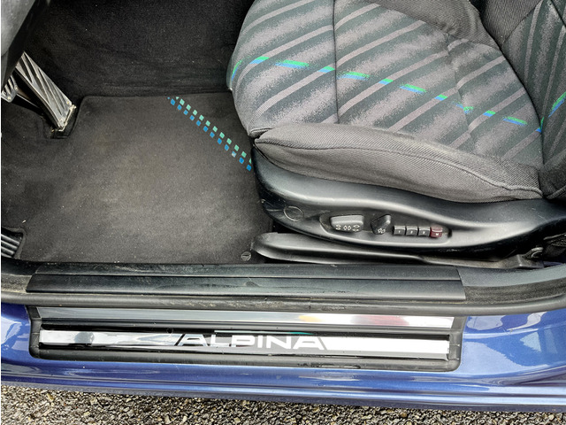 ボディーカラーは一番人気のアルピナブルー。デコラインはゴールド。最近のモデルはデコラインがシルバーになっていますが、ゴールドデコが一番カッコいいと思います。大きな傷もなくとても綺麗です。 内装はアルピナステッチの入ったシートや内張りはオリジナルのまま残されています。 ヤレもなく綺麗な内装です。