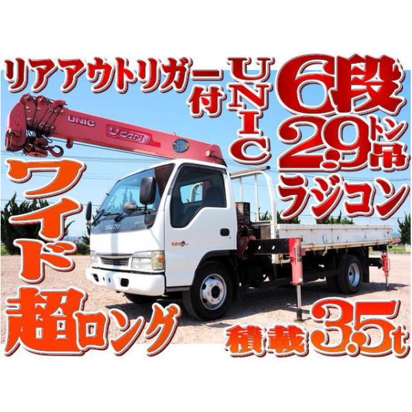 煤焼きなし!!積載3.5t!!エルフワイド超ロングの6段クレーン差し違いアウトリガーリアアウトリガーラジコン付平ボディになります。