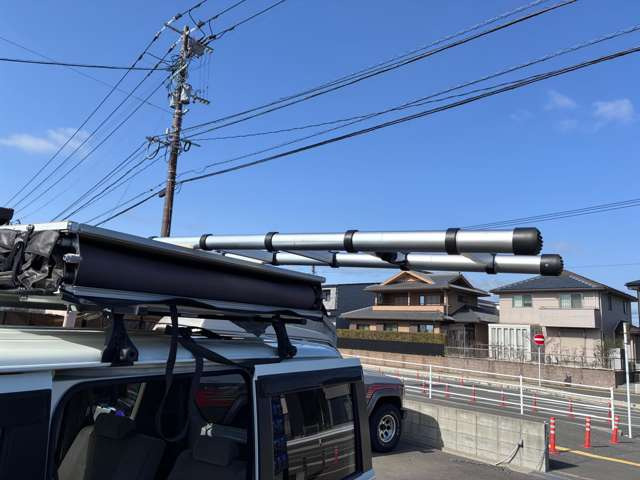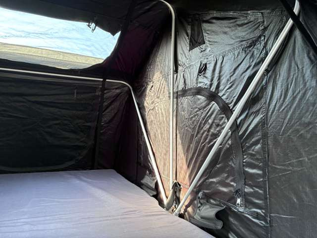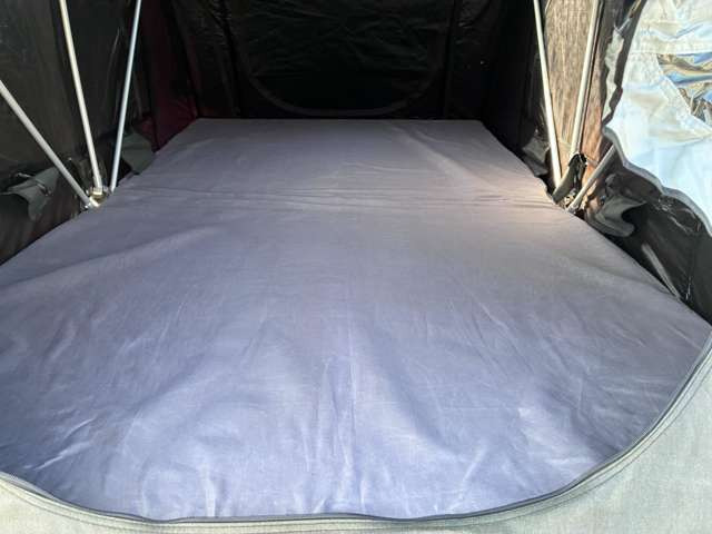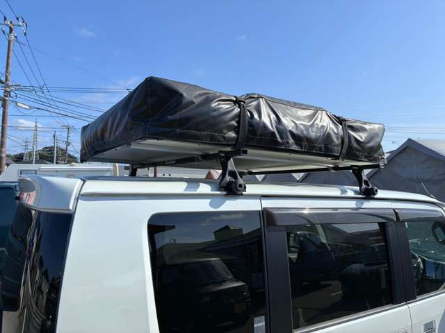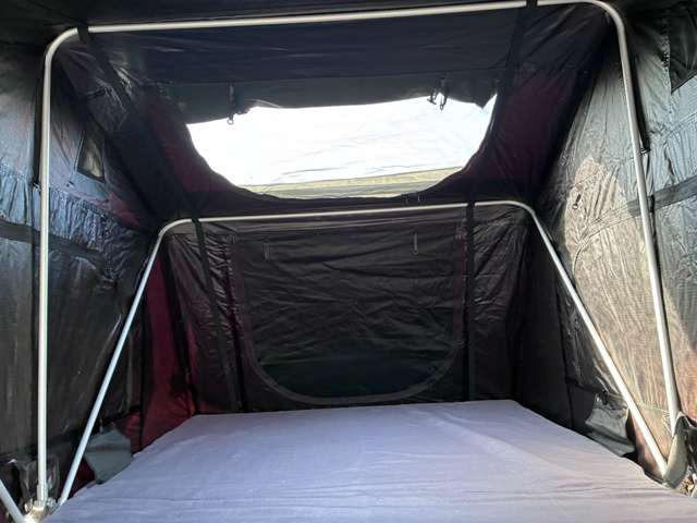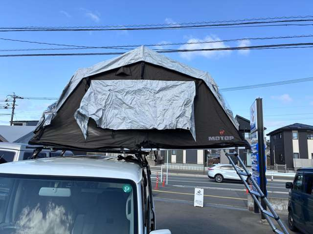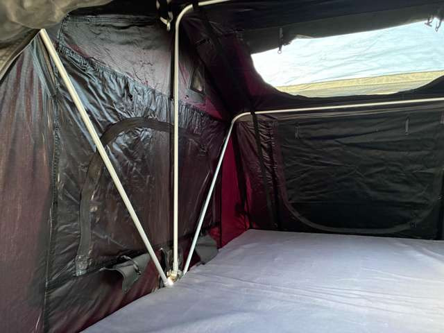 ルーフテントにベッドキット装着車両!夏に車中泊やキャンプにお勧めの車!ショートバンパーにリフトアップ、マッドタイヤで外装はオフロードスタイル!
