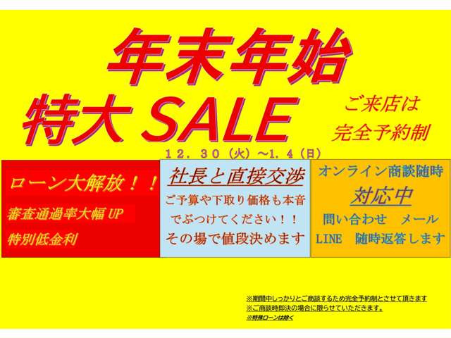 店頭商談中・売約済の場合もありますので、ご来店の際は事前にお問合せ頂き、該当車両の有無をご確認ください。
