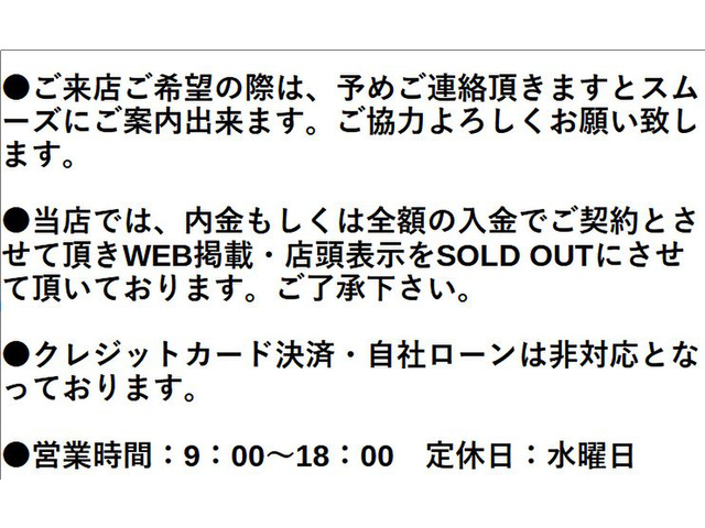 店頭商談中・売約済の場合もありますので、ご来店の際は事前にお問合せ頂き、該当車両の有無をご確認ください。