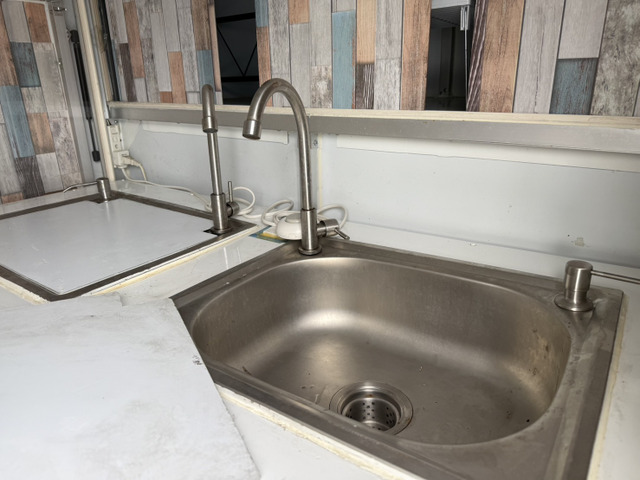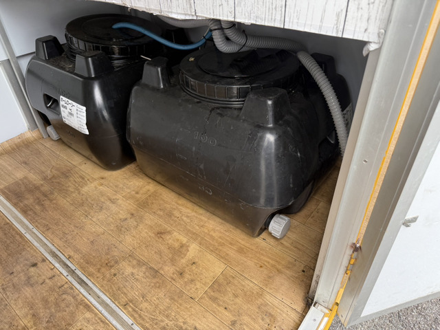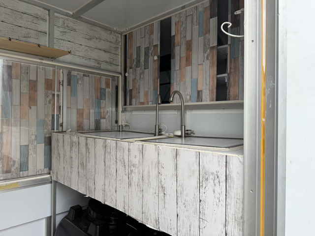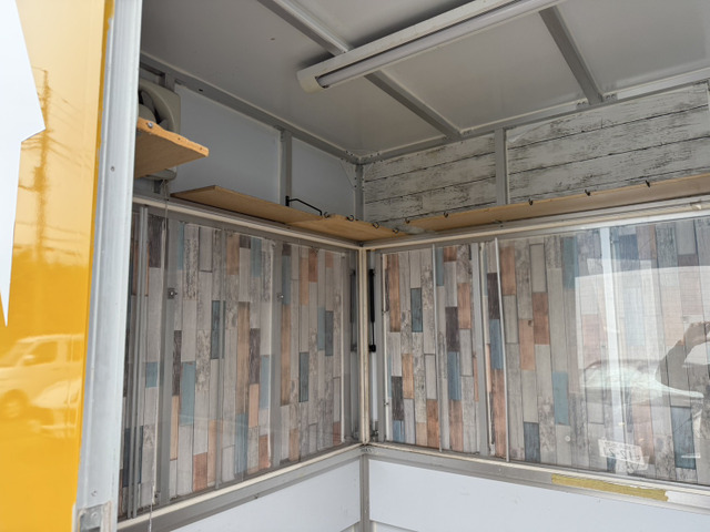 キッチンカーやケータリングサービスにも最適で、2槽シンクや跳ね上げ販売口2箇所、外部電源口、換気扇LED照明。