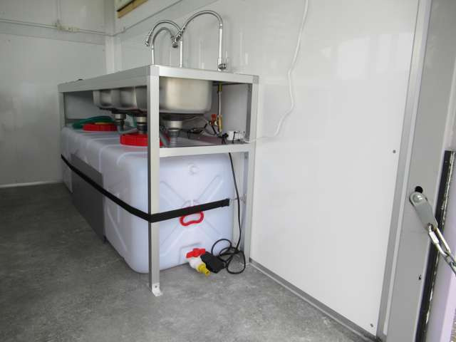 サイド跳ね上げ扉 200L給排水対応シンク ステンレス作業台 LED照明コールドテーブル 冷凍ストッカー 100V外部電源 換気扇 コンセント バックカメラ 庫内設備新品