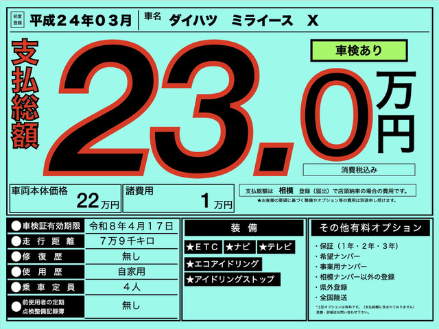【支払総額230,000円】中古車 ダイハツ ミライース