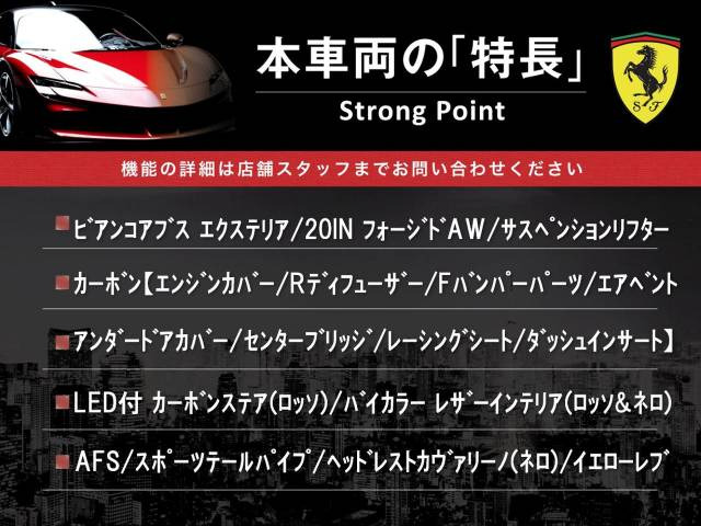 カーボン(エンジンカバー レーシングシート Rディフューザー Fバンパーパーツ センターブリッジ他) LED付カーボンステア(ロッソ) レザーインテ(ロッソ&ネロ) スポーツテール Fリフト AFS