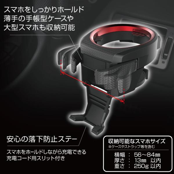 ・ドリンクとスマホを同時置きできるドリンクホルダー。