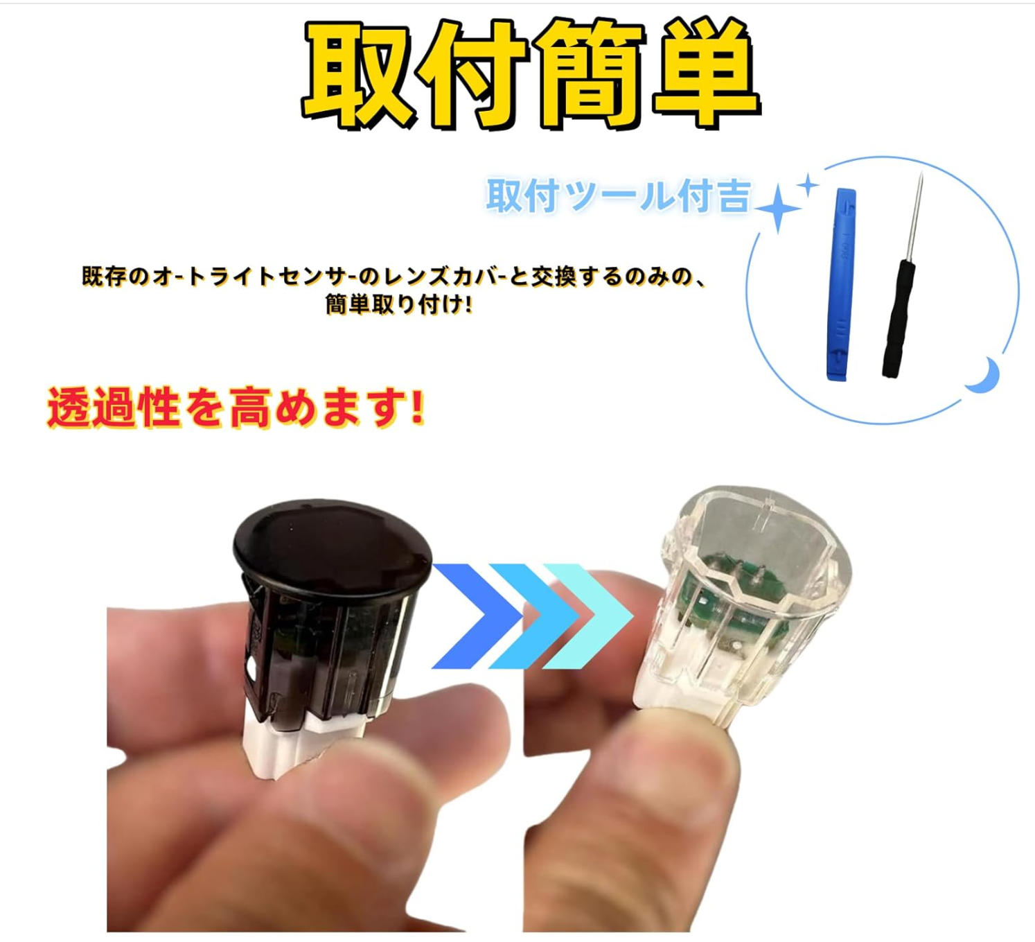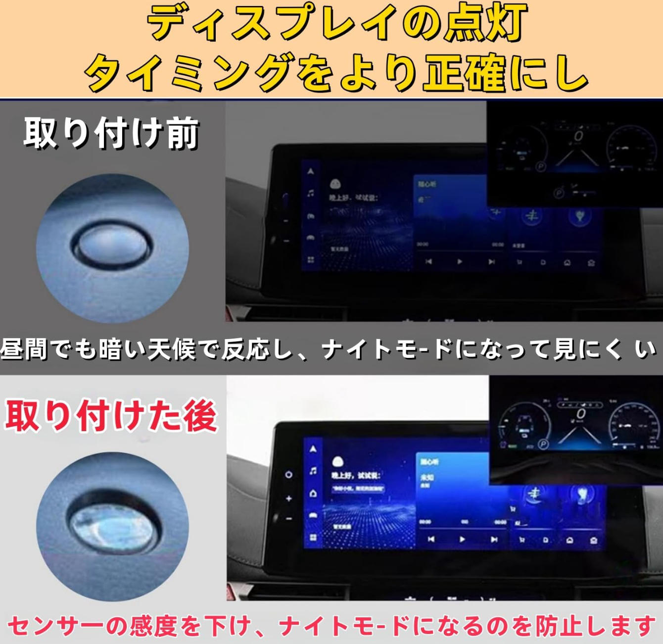 暗所での誤作動を軽減し、より自然なタイミングでライトが作動するよう補助します。装着はセンサーにかぶせるだけの簡単タイプで、純正機能を損なうことなく使用できます。