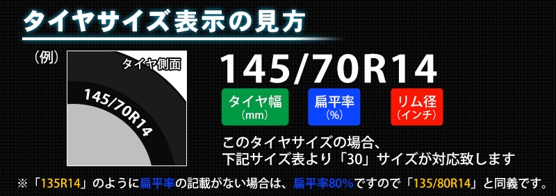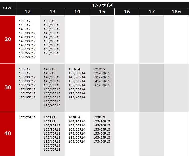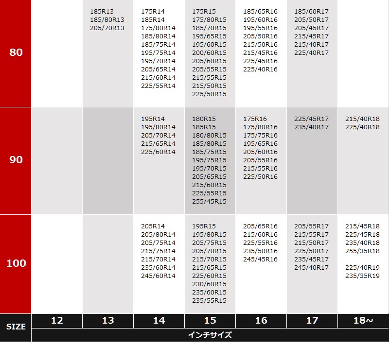 | 適合サイズ | ■14インチ 205R14 205/80R14 205/75R14 215/75R14 215/70R14 235/60R14 245/60R14 ■15インチ 195R15 195/80R15 205/75R15 205/70R15 215/70R15 215/65R15 225/60R15 230/60R15 235/60R15 235/55R15 ■16インチ 205/65R16 215/60R16 225/55R16 235/50R16 245/45R16 ■17インチ 205/55R17 215/55R17 215/50R17 225/50R17 235/45R17 245/40R17 ■18インチ 215/45R18 225/45R18 235/40R18 255/35R18 ■19インチ 225/40R19 235/35R19 |