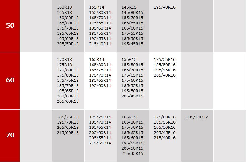 205R14 205/80R14 205/75R14 215/75R14 215/70R14 235/60R14 245/60R14 195R15 195/80R15 205/75R15 205/70R15 215/70R15 215/65R15 225/60R15 230/60R15 235/60R15 235/55R15 205/65R16 215/60R16 225/55R16 235/50R16 245/45R16 205/55R17 215/55R17 215/50R17 225/50R17 235/45R17 245/40R17 215/45R18 225/45R18 235/40R18 255/35R18 225/40R19 235/35R19 235/35R19