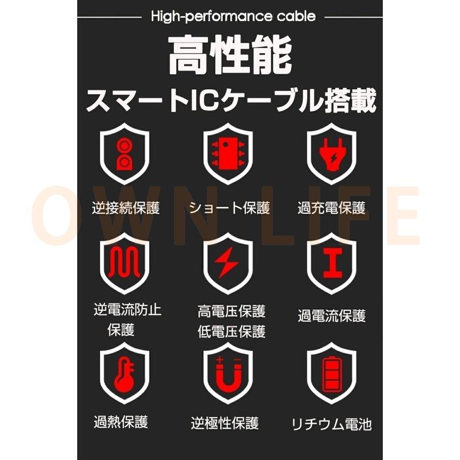【スーパー保護機能】 スマートジャンプスターターケーブルに8種類の保護機能が設計されており、短絡保護、逆接続保護、過電流保護、過放電保護、逆充電保護、サージ電圧防止などの機能でエンジンスターター本体とカーバッテリーを万全に保護できます。また、特殊な材料で作られたので、難燃性と耐衝撃性が、もっと優れていて、初心者でも安全、安心に使えます。