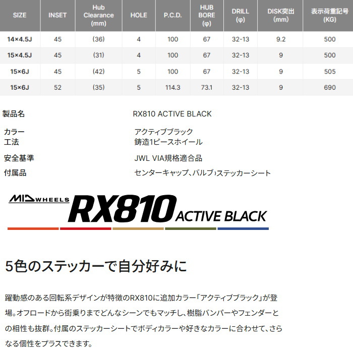 | ◆ホイール : MID WHEELS RX810 ◆カラー : アクティブブラック ◆ホイールサイズ[インチ/リム幅/インセット/穴数/P.C.D.] ◇15インチ 6J+52 5H−114.3 ★ホイールのみ 4本SET |