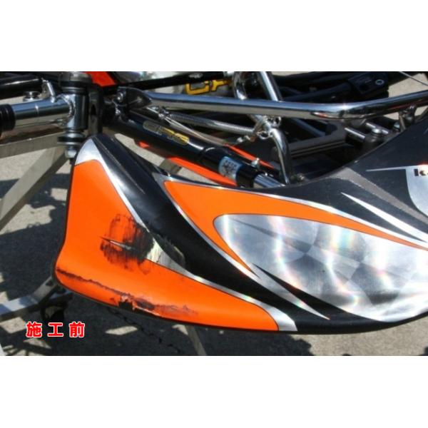 レーシングカートのバンパー(カウル)に付着したタイヤ痕・シールはがし痕・ガンコな油膜汚れの洗浄。