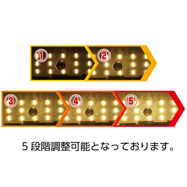 小さくて明るい新しいLED"SMD"を採用しており、明るさを5段階調整可能なので車内を明るく照らしたり、