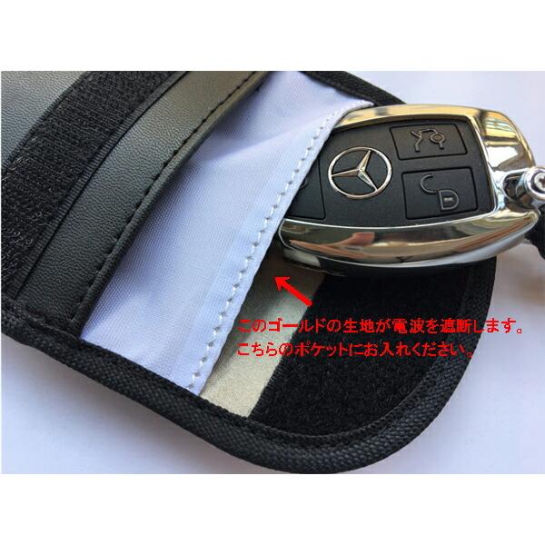 メインキーと家の中の予備キー用に!最近急激に増えた、リレーアタックによる車の盗難。家の中やあなたのポケットの中にあるスマートキーの電波をキャッチし中継する事により、離れた愛車のロックを解除、エンジン始動をされて、あっと言う間に愛車が盗まれてしまいます。それを未然に防ぐのがこのスマートキーケース!内側の電波遮断生地により、スマートキーが発する電波を遮断します。【注意】ゴールド色の部分のポケットにスマートキーをお入れください。もう1つのポケットはその他小物を入れる部分ですので、そちらに入れても電波を遮断しません。