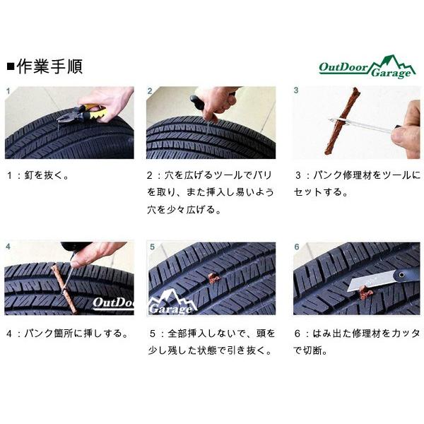 | 商品詳細 | チューブレスタイヤのパンク修理用 ■セット内容(トップ画像通り) ・通常パンク修理きっと:ツール2本、ラバーセメント1本、パンク修理材×3本(長さ約10cm) ・プラス時短パンク修理ネジ小&大 ■作業手順(通常): 1:プライヤなど釘を抜く。 2:穴を広げるツールでバリを取り、また挿入し易いよう穴を少々広げる。 3:パンク修理材を挿入ツールにセットし、表面にボンドを塗り。 4:パンク箇所に挿し、しっかりと奥まで刺す。 5:ゆっくりと挿入ツール引き抜く。 6:はみ出た修理材をカッターで切断。 |