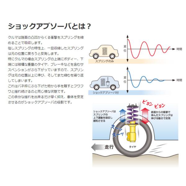 ショックアブソーバの働きでスプリングの伸び縮みの動きを抑制し、ふらつきやタイヤの接地性変化を抑えます。
