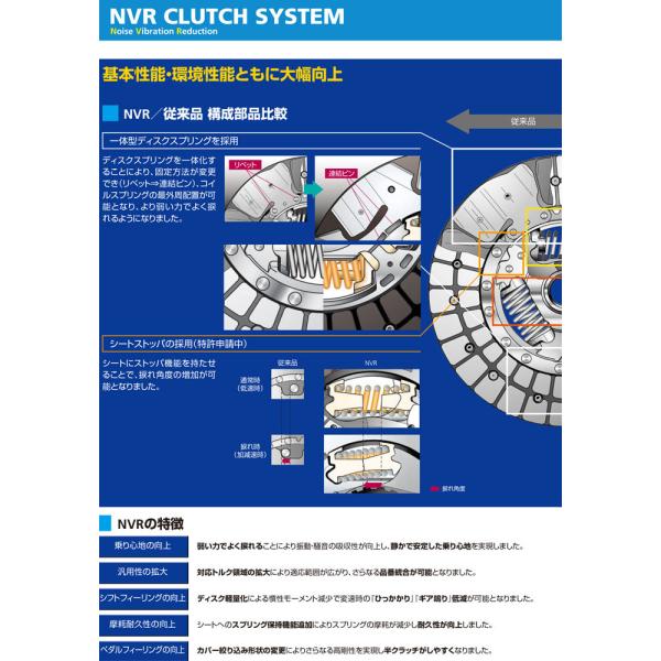NVRクラッチディスク&カバーは細部に至る改良により、燃費向上や乗り心地の安定を図ると共に、摩擦に対する耐久性を向上させ、長寿命化を実現しました。