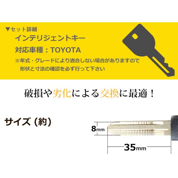 | ■商品情報 ・メーカー:トヨタ スマートキー用 ・車種:アクア/AQUA ・規格:TOY43 ・ブレード部長さ:35mm ・ブレード部幅:8mm ・鍵溝:外溝 |