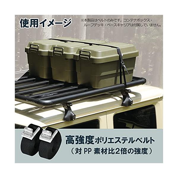 商品紹介 積載物をしっかり固定することができる高強度ベルト。脚立等の長尺物の固定に便利な全長2.2m。 ルーフラックへの積載物固定に便利な2本入り。 屋外使用でも劣化しにくい、ポリエステル製ベルトです。(PP素材比2倍の強度) 耐久性がアップした亜鉛ダイカストクロームメッキのバックルを採用しています。 長さ:2.2m×2本使用荷重:60kgf破断強度:150kgf(新品時、1本当たり) 安全警告 ●本製品は固定物をしない一般的なベルトであるため、使用中の損傷、破損、および事故などは弊社として責任を負いかねますのでご了承ください。 ●本製品は自動車用ルーフキャリアの荷物固定以外の用途には使用しないでください。