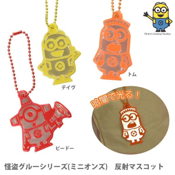 怪盗グルーシリーズからミニオンズデザインの反射マスコットが登場!暗闇でライトの光を反射してピカッと光る!リフレクター反射マスコット!夜間の歩行時、自転車・バイクのライトを反射して存在を知らせます!ストラップ部分が反射素材になっており、暗闇でライトの光を反射して光ります。夜道の交通安全に役立つアイテムです。グルー ミニオン