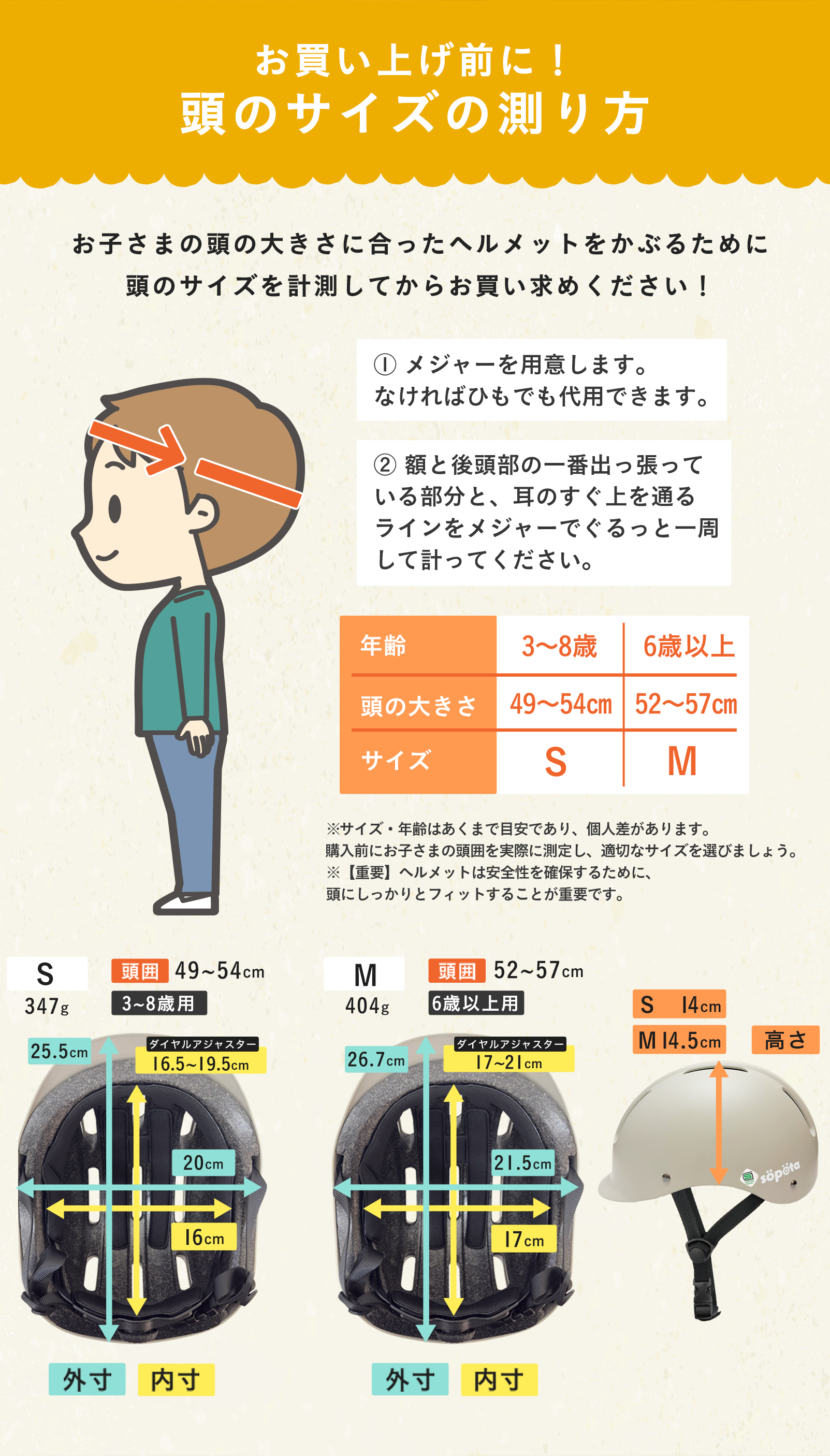 お子さまの頭に合ったサイズのヘルメットをかぶるために 商品画像を参照し、頭のサイズを計測してからお買い求めください。