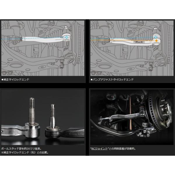 ?誰もが不快に感じるローダウンの弊害、それはタイロッドの異常な角度が原因で起こるバンプステアによるものです。バンプステアはサスペンションがストロークする際に極端なトー変化をともない、走行時における直進性の悪化を招きます。悪路で激しくステアリングがとられるのはこのためです。また、コーナリング時のステア特性に多大な影響を及ぼし、旋回性能を低下させる要因にもなります。“バンプアジャストタイロッドエンド”は、それらすべてのリスクを解消するために誕生したジオメトリー補正アイテムです。
