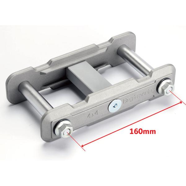 リーフスプリングの装着位置を下げる、リフトアップ必須パーツです。サイドプレートにはA7075T6処理された鍛造アルミ製を採用して強度を高めているほか、ブッシュを介してリーフを支えるピンはハイテンションよりも強固なクロモリを採用。