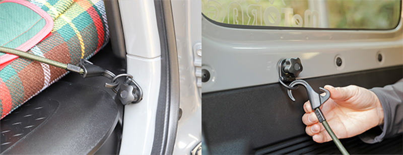 ラゲッジルームにフック固定ポイントを追加。荷物固定の幅が広がる追加フック。工具不要で脱着可能。