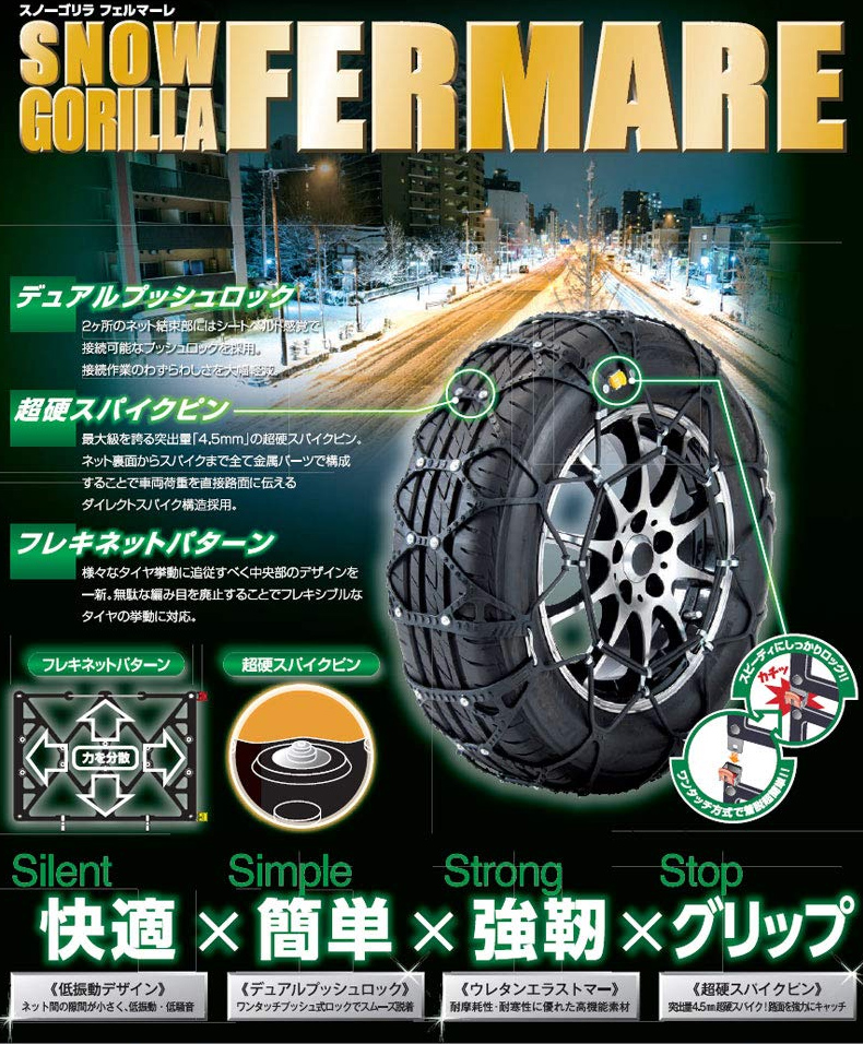 コストパフォーマンスと乗り心地に特化した非金属ネットチェーン。ジャッキアップ不要、シートベルト感覚で着脱可能。