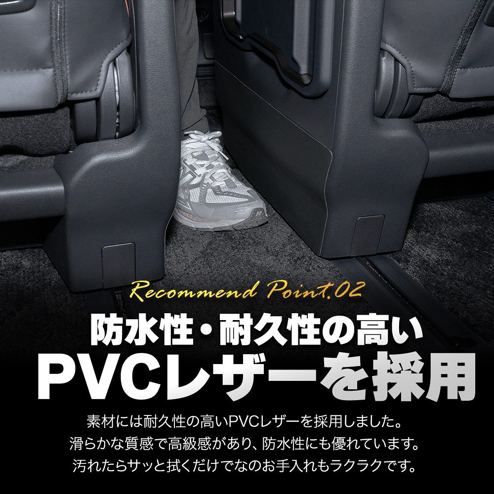 アルファード ヴェルファイア 40系専用の2列目ウォークスルーキックガードです。高品質なPVC素材を使用し、2列目から3列目への車内移動時に、靴が当たることによる傷や汚れをしっかり保護します。専用設計のため、ぴったりとフィットし、取り付けも簡単です。車内のドレスアップにもなり、カスタム初心者の方でも、手軽に愛車をグレードアップできるおすすめのアイテムです。