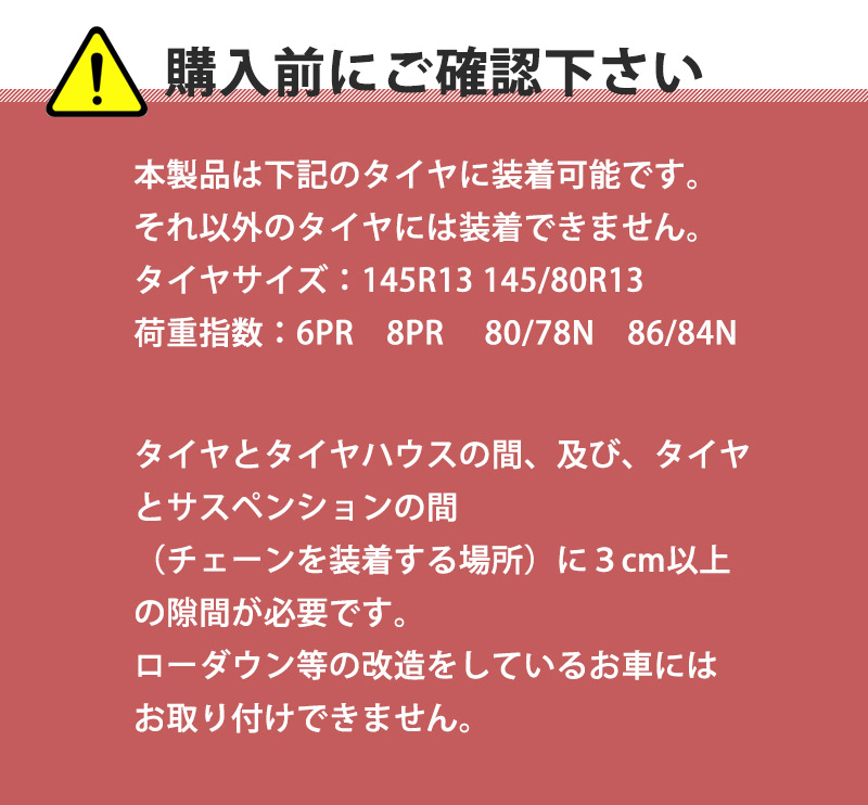※チェーンの切断・摩耗が早まるため、お車の積載可能重量以上に荷物を積んだお車には使用できません。