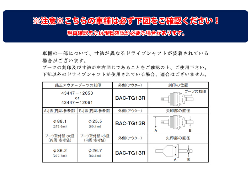 ・車種: トヨタ ウィッシュ ・車両型式: ZNE10G ・年式: H15.01 - H21.03 ・備考: ・備考2: 左側 ・商品番号: BAC-TG13R | ||||