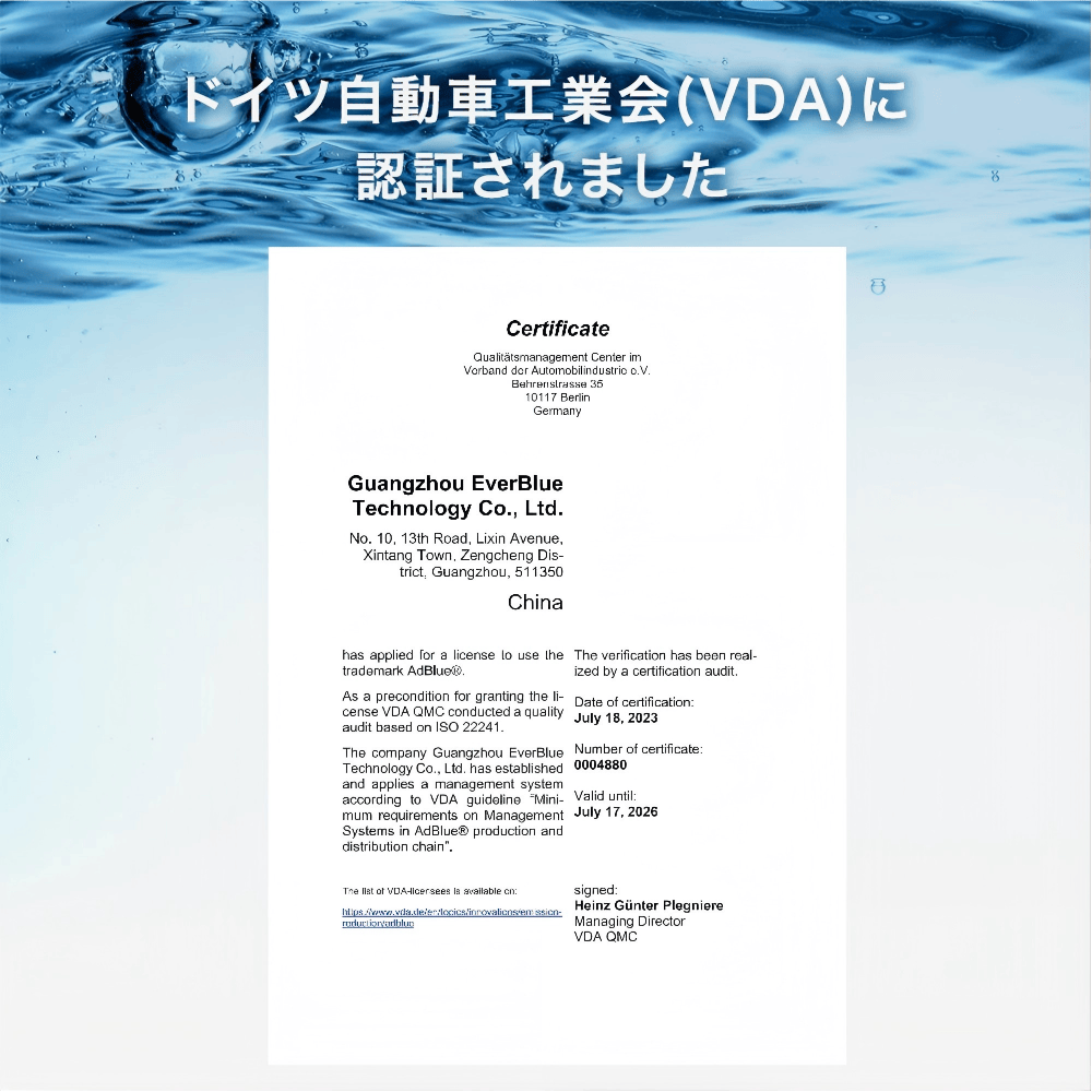 ●ドイツ自動車工業会(VDA)認証 で 厳しい基準をクリアしたSCRシステム専用の高品質尿素水