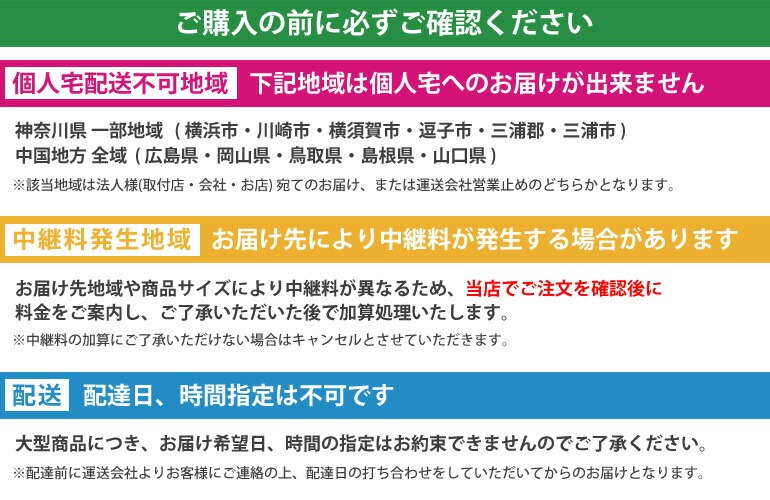 | ・ | 下記地域は法人(取付店・会社・お店)宛てのお届け、または運送会社営業所止めのどちらかとなります。 |