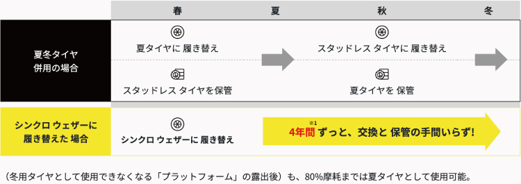 SYNCHRO WEATHERなら、履き替え不要で4年間 ※1 使用できて、保管や交換不要
