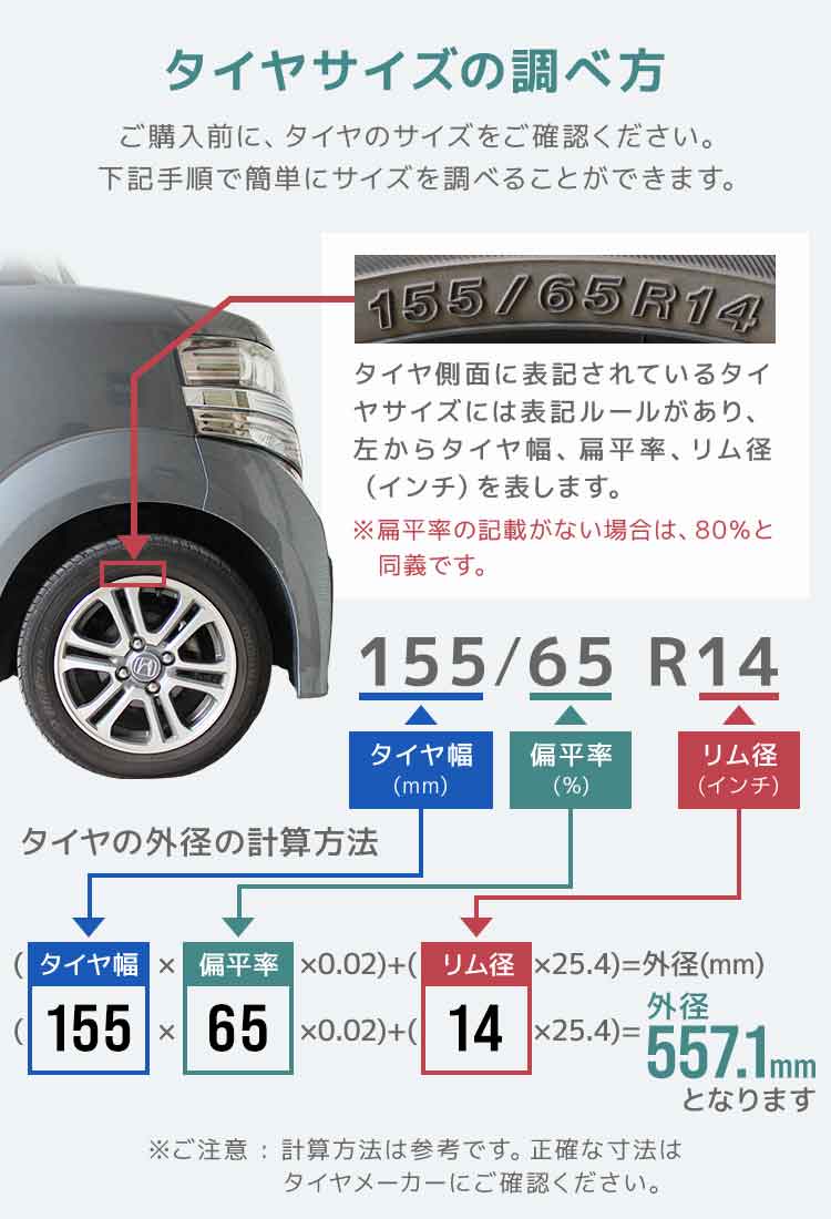 ※メーカー・銘柄・夏用タイヤ・冬用タイヤ等で大きさが異なり装着できない場合があります。詳しくは販売ディーラーにて確認して下さい。