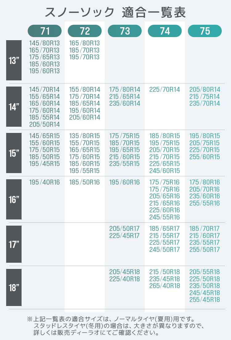 | 73 | 175/80R14 165/80R15 | 175/75R15 205/70R14 185/70R15 | 215/65R14 195/65R15 235/60R14 215/60R15 195/60R16 | 235/55R15 215/55R16 235/50R16 205/50R17 | 235/45R17 205/45R18 225/40R18 | - | |